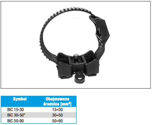Uchwyty wykonane są z tworzywa sztucznego odpornego na promieniowanie UV i wpływ niekorzystnych warunków atmosferycznych. Uchwyty BIC 30-50/50-90 i BICDB 30-50 posiadają zintegrowaną, otwieralną opaskę zaciskową.