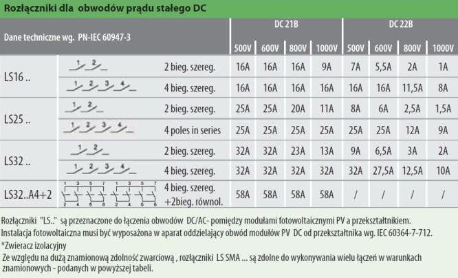 Prezentowany rozłącznik LS służy do przyłączania lub odłączania przekształtników DC/AC lub innych części obwodu prądu stałego do modułów fotowoltaicznych PV. Jego konstrukcja pozwala na łączenie prądów znamionowych do 58A i napięciu 1000V DC w kategorii pracy DC21B. Natomiast konstrukcja styków rozłącznika oraz specjalnie dobrane materiały gwarantują pełną czystość styków (brak oksydacji) oraz niskie straty mocy nawet przy małej częstotliwości łączeń. Dodatkowo należy wspomnieć, iż szybkość zamykania lub otwierania styków nie zależy od prędkości oraz siły działania operatora.