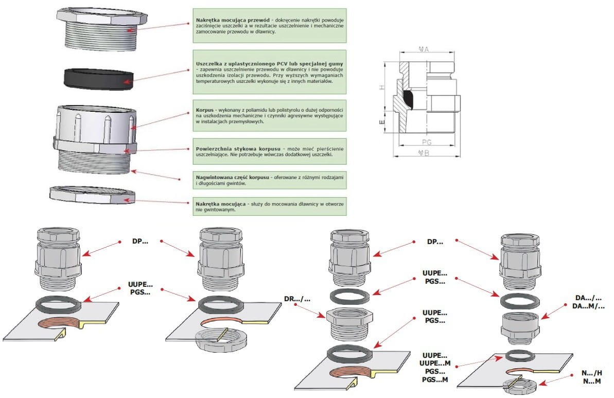 Dławnica izolacyjna poliamidowa oferowana w PROSPERSKLEP SOSNOWIEC przeznaczona jest do stosowania w przemysłowych instalacjach elektrycznych. Służy do wprowadzania kabli do szaf elektrycznych, rozdzielnic i urządzeń elektrycznych. Głównym zadaniem jest częściowe usztywnienie wprowadzanego odcinka kabla celem zabezpieczenia przed uszkodzeniami mechanicznymi, a w niektórym przypadku ochrona przewodu oraz wnętrza szafy lub urządzenia elektrycznego przed ewentualnymi zanieczyszczeniami jakie mogą wniknąć poprzez otwór, którym wprowadza się przewód (w tym także zapewnić wodoodporność). Prosta budowa i związana z nią niska cena pozwalają na stosowanie tej dławnicy wszędzie tam, gdzie nie są wymagane wysokie stopnie ochrony. Dławnica izolowana ERGOM DP 7 z nakrętką i podkładką uszczelniającą oraz gwintem PG wykonana z wysokiej jakości materiału nie zmienia swoich właściwości i koloru z upływem czasu. Pozwala to na zachowanie estetycznego wyglądu instalacji przez cały czas eksploatacji.