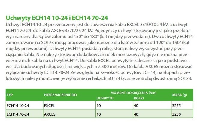 Uchwyt ECH14 10-24 przeznaczony jest do zawieszenia kabla EXCEL 3x10/10 24 kV, a uchwyt ECH14 70-24 do kabla AXCES 3x70/25 24 kV. Pojedynczy uchwyt stosowany jest jako przelotowy i narożny dla kątów załomu od 150° do 180° (kąt między przewodami). Dwa uchwyty ECH14 zamontowane na SOT73 mogą pracować jako narożne dla kątów załomu od 120° do 150° (kąt między przewodami). Uchwyty ECH14 posiadają rolkę, którą należy wykorzystać przy przeciąganiu kabla. Nie należy stosować dodatkowych rolek montażowych, gdyż nie można przewiesić z nich kabla na uchwyt ECH14. Do kabla EXCEL uchwyty te zalecane są jako podstawowe dla budowanych długości linii większych niż 500 metrów. Do kabla AXCES można stosować wyłącznie uchwyty ECH14 70-24.Ze względu na szerokość uchwytów ECH14, na słupach przelotowych należy montować je wyłącznie na hakach SOT74 łącznie ze śrubą dwustronną SOT78.