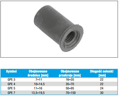 Osłonka końca przewodu GPE 5 (11-16mm) 50-95 służy do osłaniania końca żyły przewodu izolowanego przed dostępem wody i wilgoci. Wykonana z gumy odpornej na zmienne warunki atmosferyczne i promieniowanie UV.
