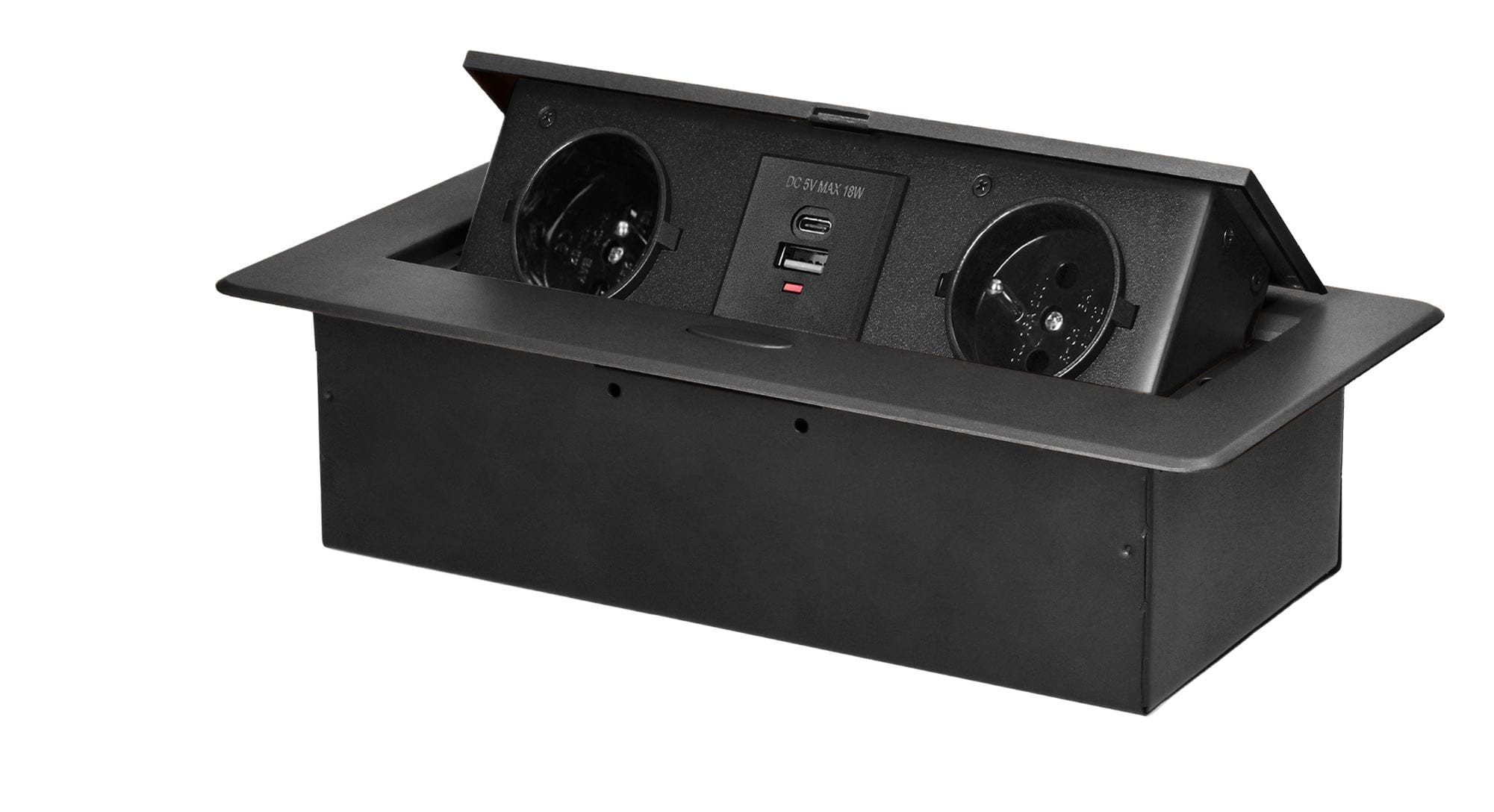Gniazda meblowe 2x230V AC, 2xUSB wpuszczane w blat grafitowe ORNO OR-GM-9034/GR z uziemieniem w obudowie chowanej w blat. Urządzenie przeznaczone do montażu w biurkach, blatach i stołach. Wykonane ze stopu cynku i stali, może być zamontowane zarówno w pionie jak i w poziomie zapewniając tym samym swobodny dostęp do gniazd elektrycznych. W czasie nie używania gniazdka można zamknąć pokrywę ochronną niwelując ryzyko przypadkowego zalania, zakurzenia czy uszkodzenia. Posiada stopień ochrony IP20 i doskonale sprawdzi się w domu, biurze lub w suchych strefach kuchni. Jest wyposażone w ładowarkę USB, pozwala na zasilanie 2 urządzeń o napięciu 230V i jednoczesne ładowanie 2 urządzeń mobilnych.