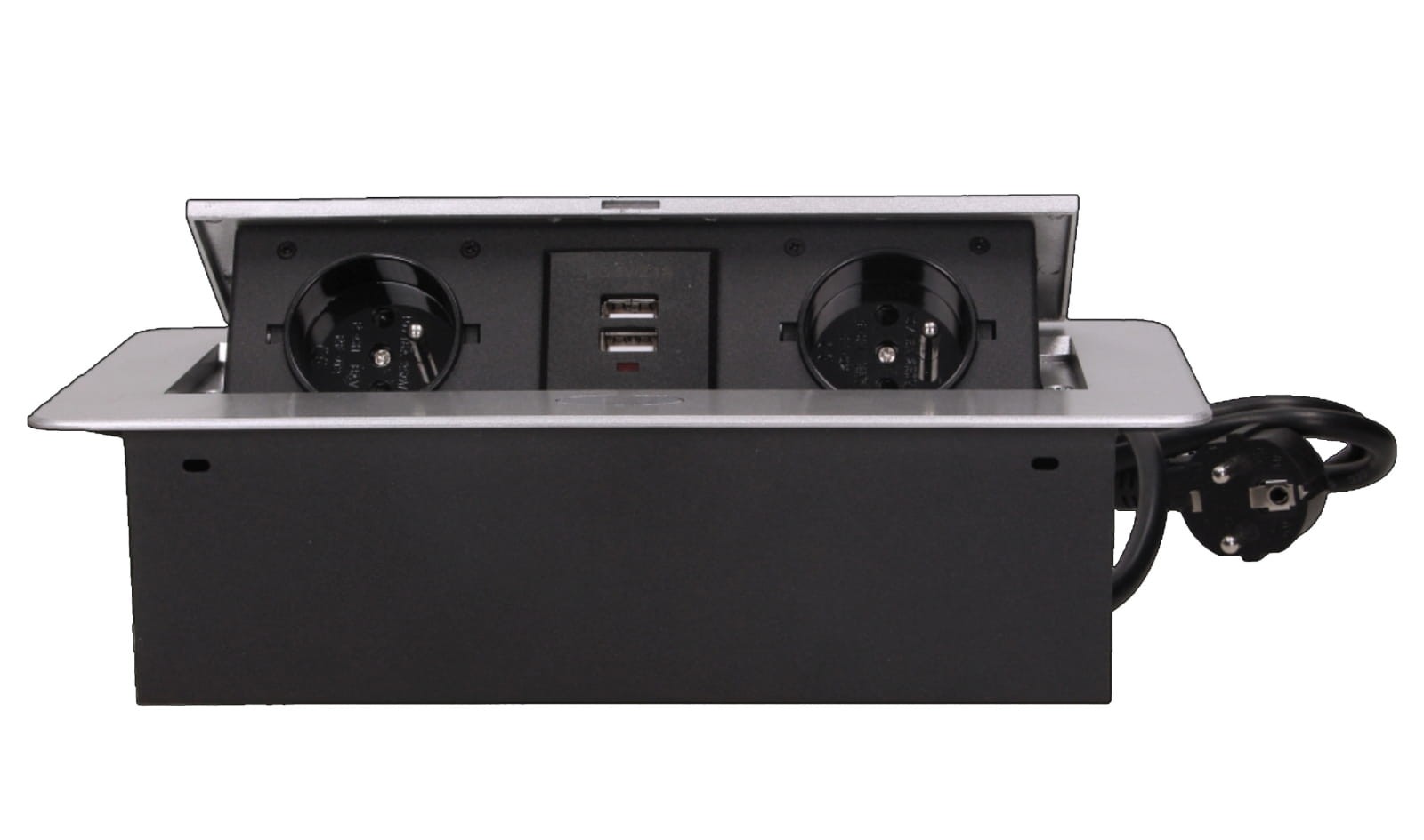 Gniazda meblowe 2x230V AC, 2xUSB z przewodem 3,0m chowane w blat srebrne