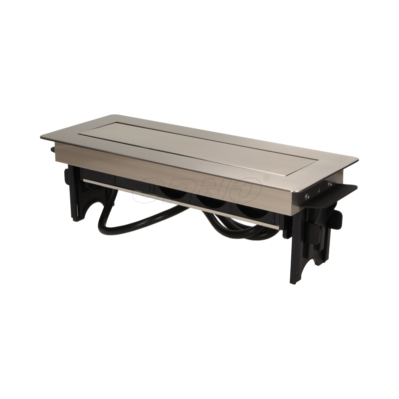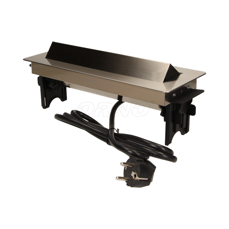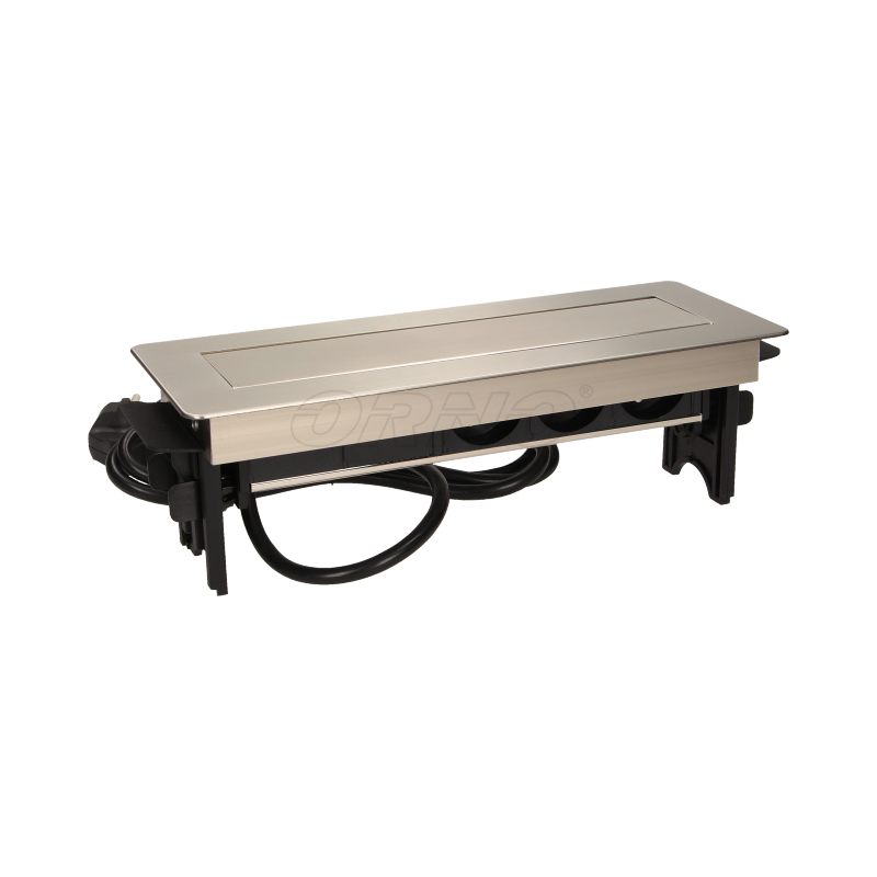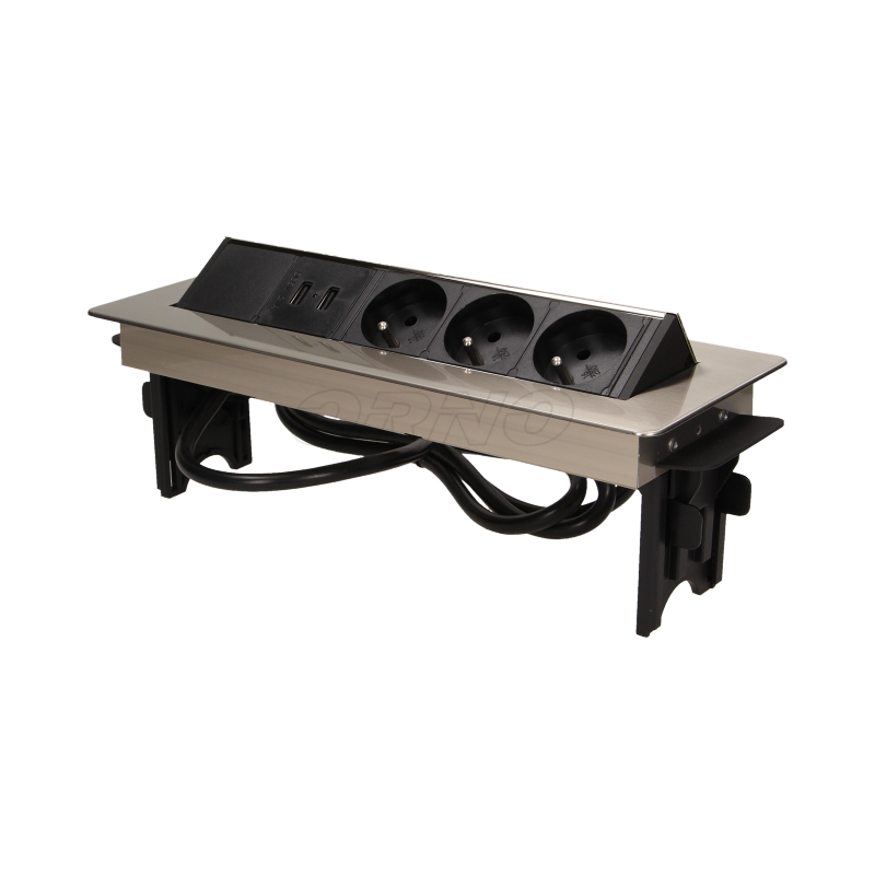 Gniazda meblowe 3x2P+Z, 2xUSB niklowana obudowa chowane w blat 3x250V ORNO OR-AE-1364 w niklowanej obudowie z ładowarką USB i przewodem 1,8m. Zestaw trzech gniazd sieciowych 250V AC/16A z uziemieniem i dwóch portów ładowarki USB w niklowanej obudowie, chowanej w blat. Urządzenie przeznaczone do montażu w biurkach, blatach i stołach.