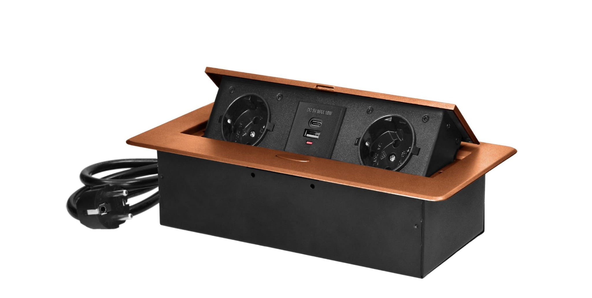 Gniazda meblowe schuko 2x2P+Z, 2xUSB, przewód 1,5m wpuszczane w blat złote Orno OR-GM-9035(GS)/C w obudowie chowanej w blat. Urządzenie przeznaczone do montażu w biurkach, blatach i stołach, wykonane ze stopu cynku i stali, może być zamontowane zarówno w pionie jak i w poziomie zapewniając tym samym swobodny dostęp do gniazd elektrycznych. Zamykana obudowa gniazd zapobiega dostawaniu się wszelkich drobinek do środka urządzenia. Gniazdo wyposażono w 2 gniazda z uziemieniem, typu Schuko (2P+Z), 2 gniazda USB (typ A+C; 3,6A) oraz oraz przewód zasilający o długości 1,5m i przekroju żyły 1,5mm². Posiada stopień ochrony IP20 i doskonale sprawdzi się w domu, biurze lub w suchych strefach kuchni.