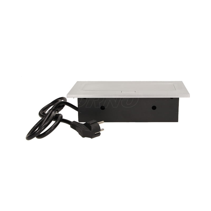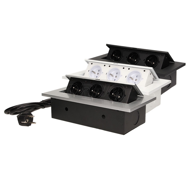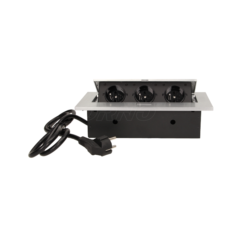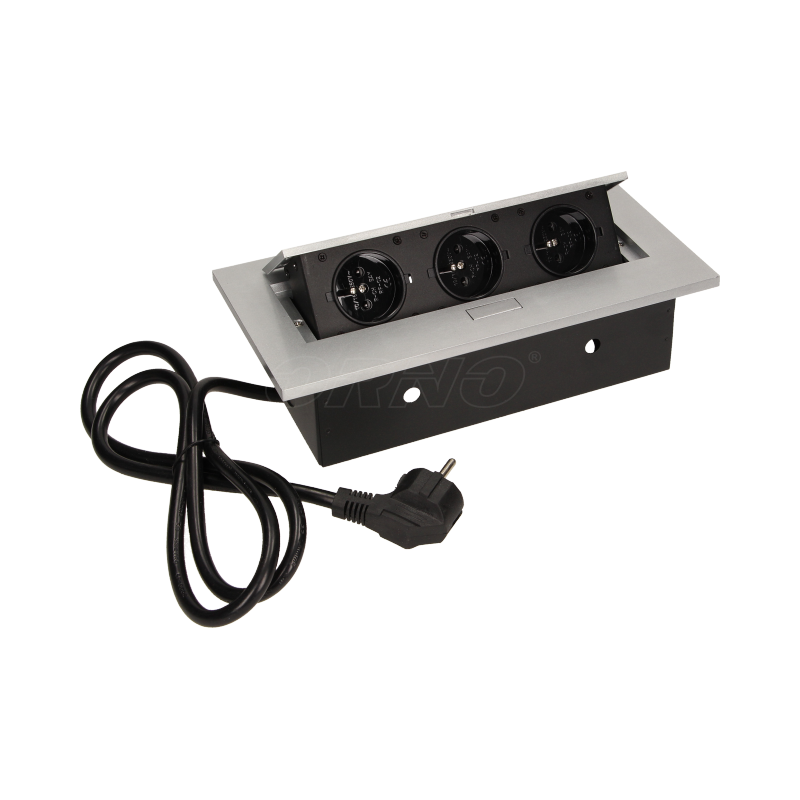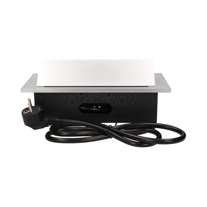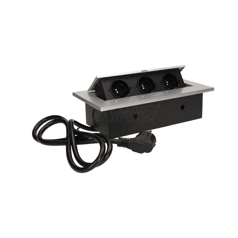 Gniazda wpuszczane w blat 3x250V 1,5m z grubym rantem i przewodem Orno OR-AE-1338 zestaw trzech gniazd sieciowych 250V AC/16A z uziemieniem, przewodem 1,5m i wtyczką, w obudowie chowanej w blat. Przeznaczone do montażu wewnątrz pomieszczeń w biurkach, blatach i stołach, zarówno w pozycji pionowej jak i poziomej, zapewniając dostęp do gniazd elektrycznych.