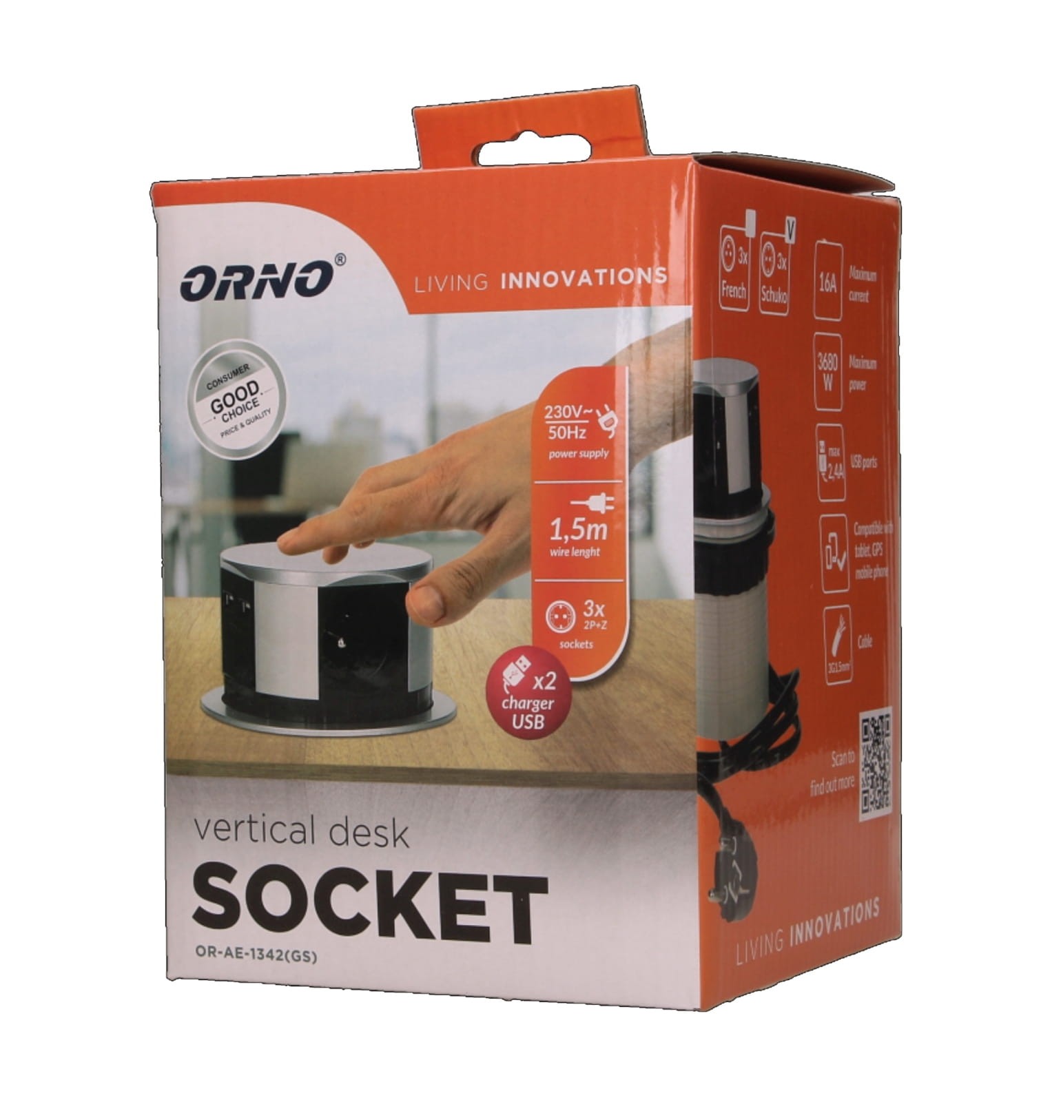 Nowość w asortymencie śląskiego potentata branży elektro-energetycznej PROSPERSKLEP. Gniazdo meblowe, wysuwane z blatu 3x250V AC z ładowarką USB i przewodem 1,5m, OR-AE-1342 GS schuko ORNO POLSKA. Zestaw trzech gniazd sieciowych 2P+Z z uziemieniem i dwóch portów ładowarki USB w obudowie chowanej w blat. Urządzenie przeznaczone do montażu w stołach konferencyjnych, blatach mebli biurowych i kuchennych, hotelach. Precyzyjny mechanizm automatycznie wysuwa panel z gniazdami po naciśnięciu obudowy. Do zamontowania urządzenia w blacie stołu potrzebny jest jedynie otwór o średnicy zaledwie 9,5cm, a głębokość zabudowy to tylko 10cm. Wyposażone w przewód o długości 1,5m.