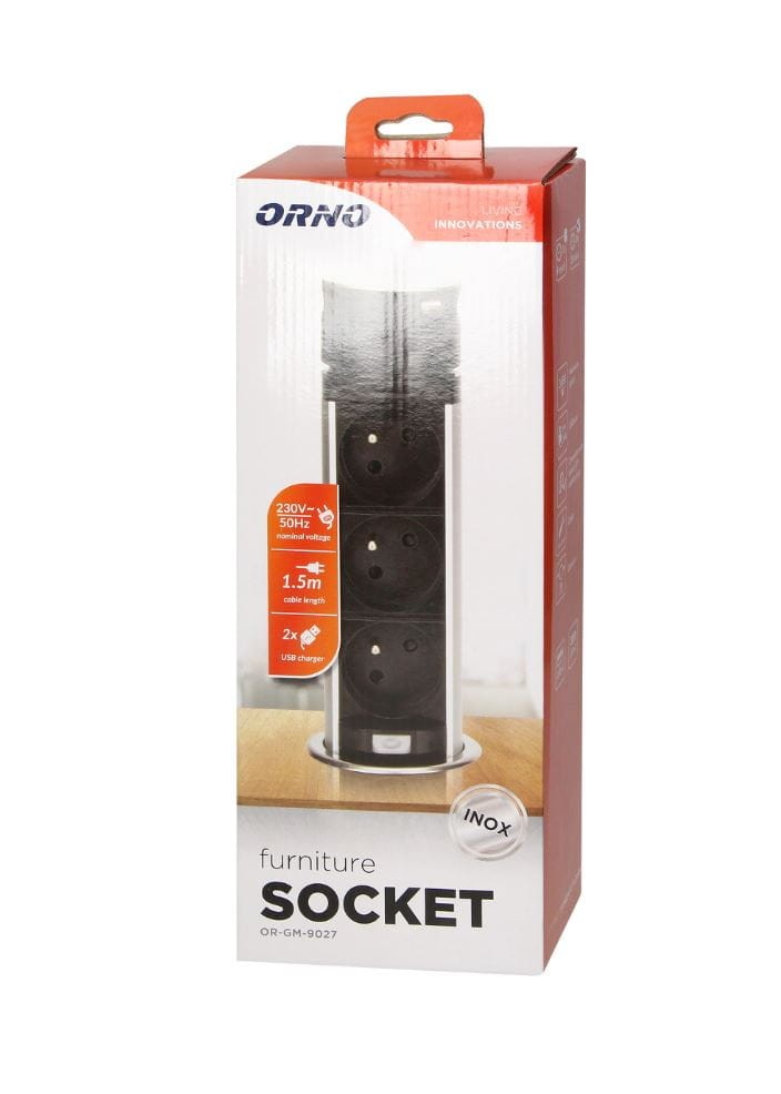Gniazdo meblowe ⌀6cm 3x250V AC wysuwane z blatu z ładowarką USB przewodem 1,5m Orno OR-GM-9027. Zestaw trzech gniazd sieciowych French (typ E) z uziemieniem i dwóch portów ładowarki USB (typ A) w obudowie chowanej w blat. Urządzenie przeznaczone do montażu w stołach konferencyjnych, blatach mebli biurowych i kuchennych. Wykonane z tworzywa sztucznego i stali nierdzewnej INOX, w kolorze czarno-srebrnym. Wymaga minimalnej ilości miejsca pod blatem, posiada wysuwany panel z gniazdami, dodatkową blokadę.