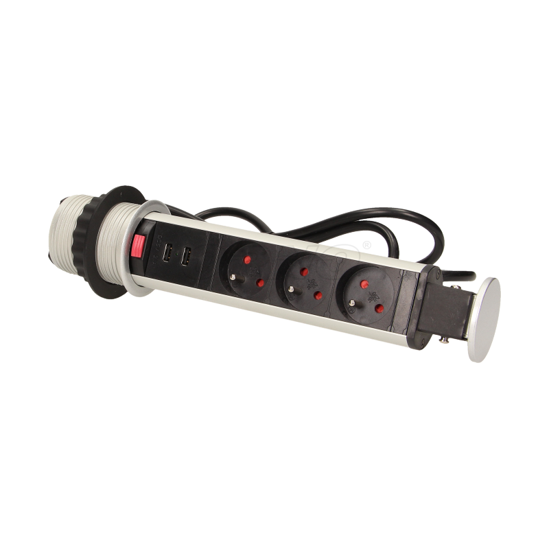 Gniazdo meblowe ⌀6cm 3x250V AC wysuwane z blatu z ładowarką USB przewodem 1,8m