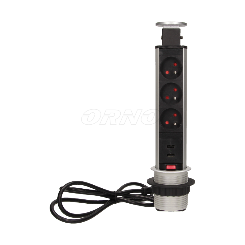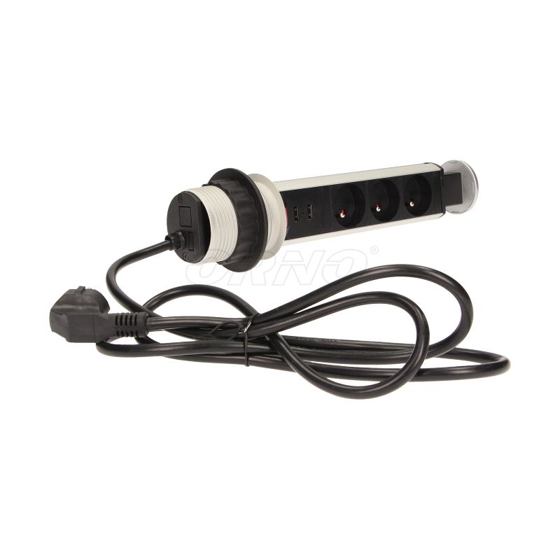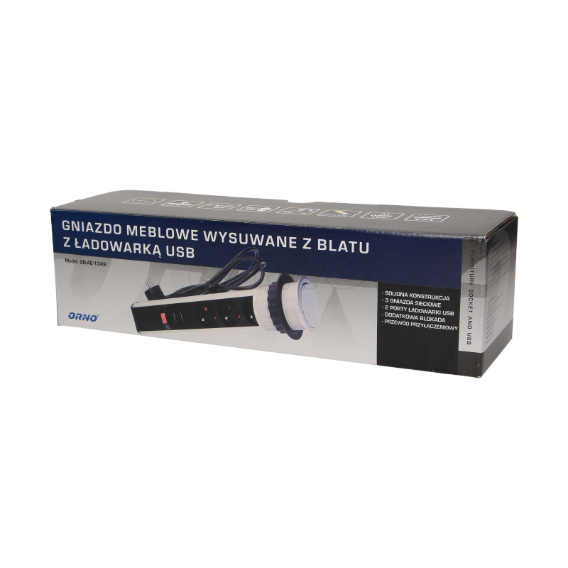 Gniazdo meblowe ⌀6cm 3x250V AC wysuwane z blatu z ładowarką USB przewodem 1,8m ORNO OR-AE-1349. Zestaw trzech gniazd sieciowych 250V AC/16A z uziemieniem i dwóch portów ładowarki USB w obudowie chowanej w blat. Urządzenie przeznaczone do montażu w stołach konferencyjnych, blatach mebli biurowych i kuchennych. Wymaga minimalnej ilości miejsca pod blatem, posiada wysuwany panel z gniazdami oraz dodatkową blokadę. Wyposażone w przewód o długości 1,8m.