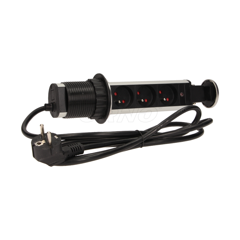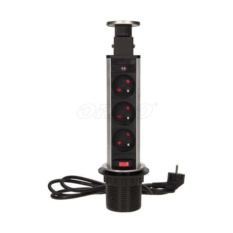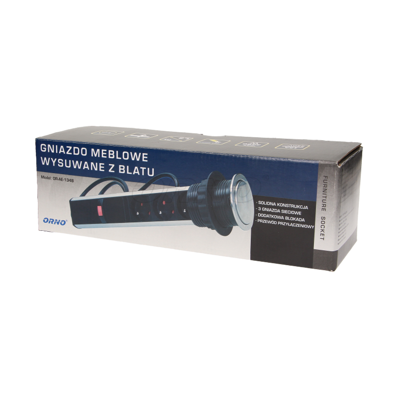 Gniazdo meblowe ⌀6cm 3x250V AC wysuwane z blatu z przewodem 1,8m ORNO OR-AE-1348. Zestaw trzech gniazd sieciowych 250V AC/16A z uziemieniem w obudowie chowanej w blat. Urządzenie przeznaczone do montażu w stołach konferencyjnych, blatach mebli biurowych i kuchennych. Wymaga minimalnej ilości miejsca pod blatem, posiada wysuwany panel z gniazdami oraz dodatkową blokadę. Wyposażone w przewód o długości 1,8m.