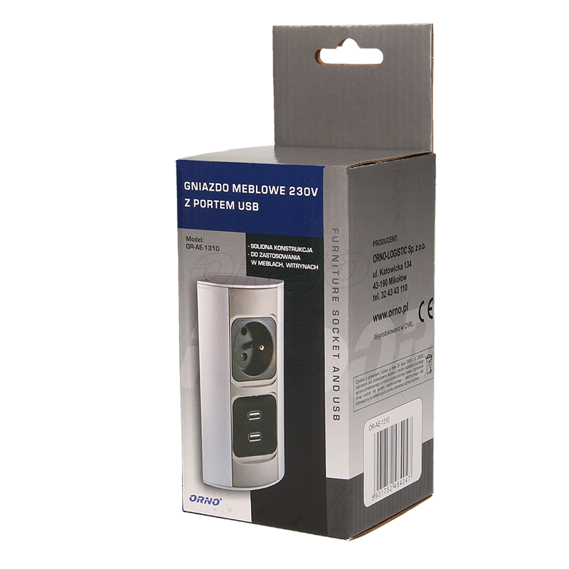 Nowość w asortymencie śląskiego potentata branży elektro-energetycznej PROSPERSKLEP. Gniazdo meblowe 1x250V AC + 2xUSB, OR-AE-1310 ORNO POLSKA. Gniazdo meblowe z uziemieniem o stabilnej i wytrzymałej konstrukcji. Idealne do do montażu w szafkach, gablotach lub witrynach. Posiada dwa porty ładowarki USB służące do ładowania urządzeń takich jak telefony komórkowe, odtwarzacze MP3 itp.