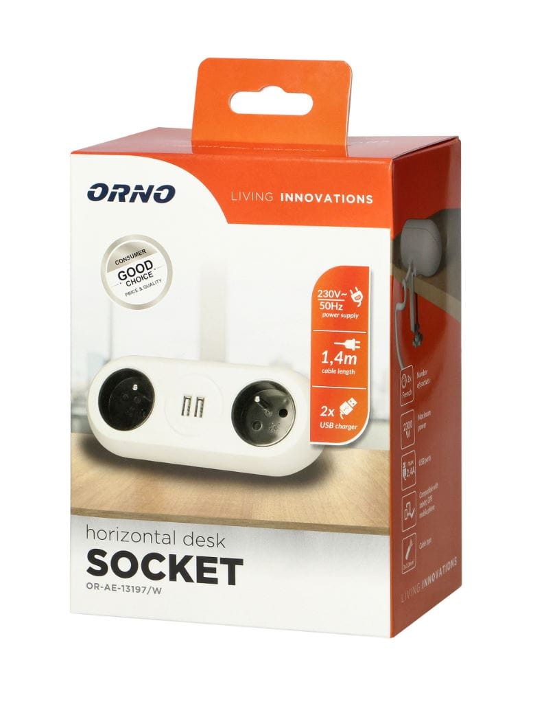 Gniazdo meblowe 2x2P+Z 250V AC 2xUSB z ładowarką biurkowe nablatowe Orno OR-AE-13197/W z ładowarką do wszelkiego rodzaju urządzeń mobilnych ładowanych przez port USB np. tablety, smartfony. Urządzenie posiada dwa gniazda sieciowe z uziemieniem i przesłonami torów prądowych, dwa porty ładowarki USB, elastyczny przewód o długości 1,4m oraz zacisk śrubowy, który umożliwia przytwierdzenie podstawy gniazd do krawędzi blatu biurka lub półki bez konieczności wiercenia otworów montażowych.