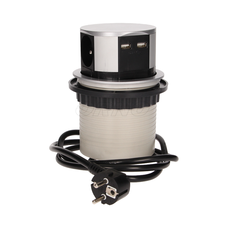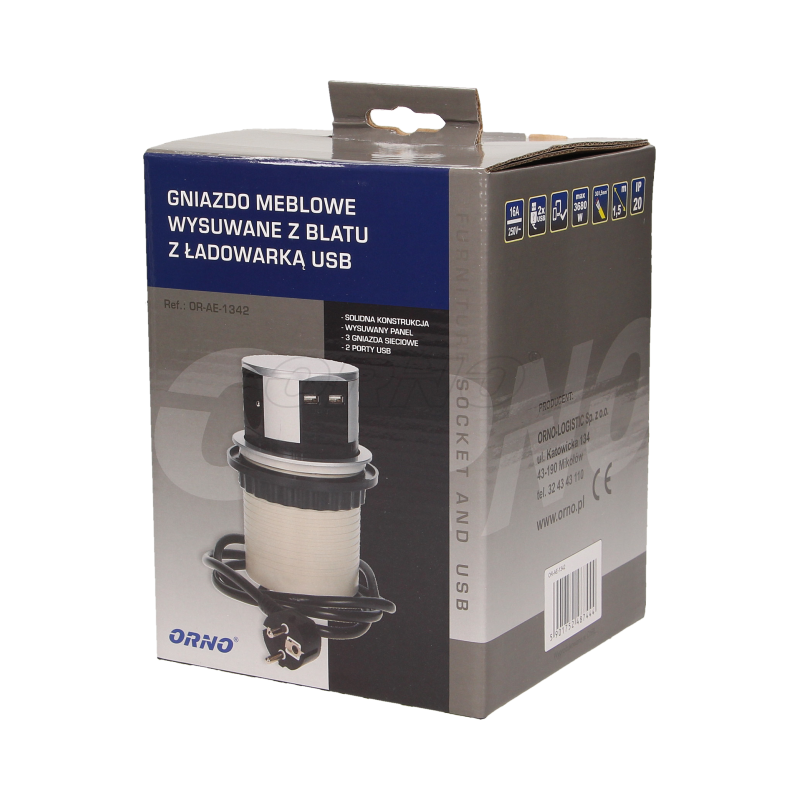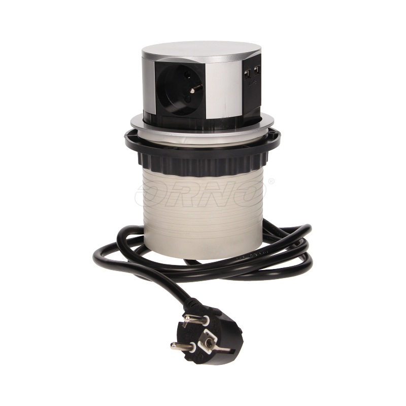 Gniazdo meblowe 3x250V AC wysuwane z blatu z ładowarką USB i przewodem 1,5m - gniazdo meblowe, wysuwane z blatu 3x250V AC z ładowarką USB i przewodem 1,5m, ORNO OR-AE-1342 to zestaw trzech gniazd sieciowych 2P+Z z uziemieniem i dwóch portów ładowarki USB w obudowie chowanej w blat. Urządzenie przeznaczone do montażu w stołach konferencyjnych, blatach mebli biurowych i kuchennych, hotelach. Precyzyjny mechanizm automatycznie wysuwa panel z gniazdami po naciśnięciu obudowy. Do zamontowania urządzenia w blacie stołu potrzebny jest jedynie otwór o średnicy zaledwie 9,5cm, a głębokość zabudowy to tylko 10cm. Wyposażone w przewód o długości 1,5m.