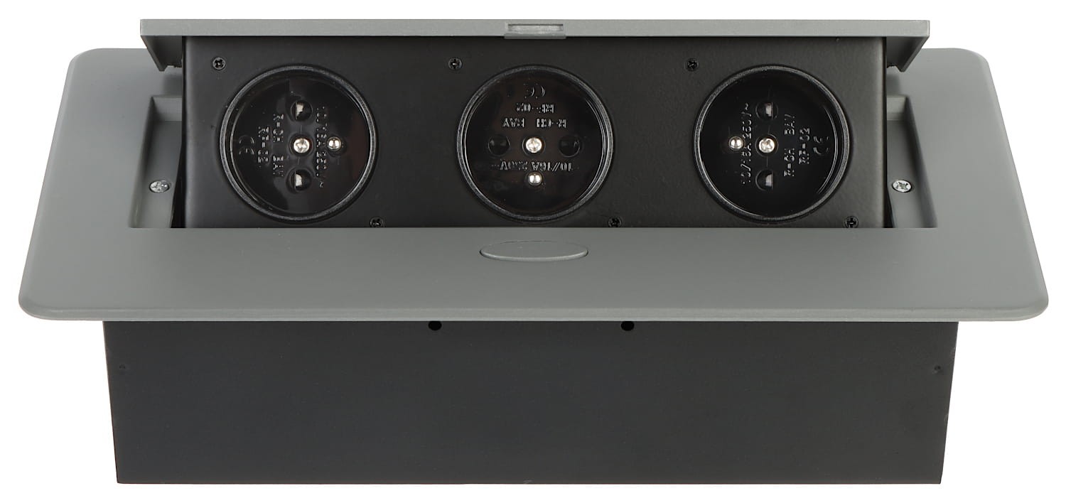 Gniazdo meblowe 3x2P+Z wpuszczane w blat srebrne to trzy gniazda sieciowe ORNO ON-GM-9032/G z uziemieniem, w obudowie chowanej w blat. Urządzenie przeznaczone do montażu w biurkach, blatach i stołach. Wykonane ze stopu cynku i stali, może być zamontowane zarówno w pionie jak i w poziomie zapewniając tym samym swobodny dostęp do gniazd elektrycznych. W czasie nie używania gniazdka można zamknąć pokrywę ochronną niwelując ryzyko przypadkowego zalania, zakurzenia czy uszkodzenia. Posiada stopień ochrony IP20 i doskonale sprawdzi się w domu, biurze lub w suchych strefach kuchni. Do jego podłączenia zaleca się kabel 3 x 1,5mm².