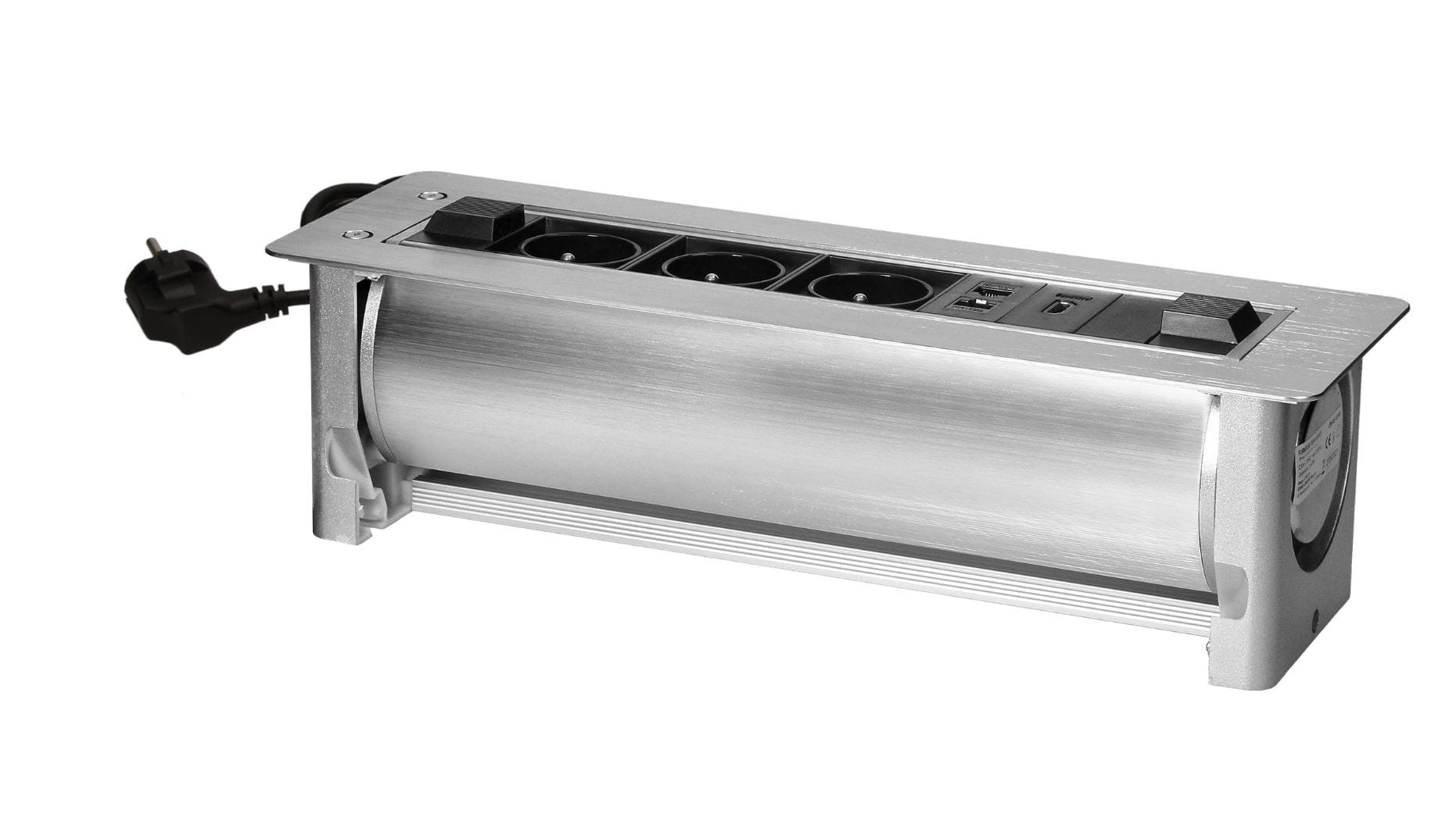 Gniazdo meblowe z elektrycznym otwieraniem 3x2P+Z 2xNET 1xHDMI Orno OR-GM-9038 ORNO POLSKA z uziemieniem, w obudowie chowanej w blat. Urządzenie przeznaczone do montażu w biurkach, blatach i stołach. Wykonane ze stopu tworzywa sztucznego i aluminium, może być zamontowane zarówno w pionie jak i w poziomie zapewniając tym samym swobodny dostęp do gniazd elektrycznych. Zamykana obudowa gniazd zapobiega dostawaniu się wszelkich drobinek do środka urządzenia. Posiada mechanizm elektrycznego otwierania i zamykania, co pozwala na obrót o 180° i zapewnia fotoelektryczne zabezpieczenie przed zamknięciem. Posiada stopień ochrony IP20 i doskonale sprawdzi się w domu, biurze lub w suchych strefach kuchni. Jest wyposażone w 3 gniazda z uziemieniem, typu francuskiego (typ E), 1 port HDMI oraz 2 gniazda network. Do zestawu został dołączony kabel o długości 1,5m i przekroju żyły 1,5mm².