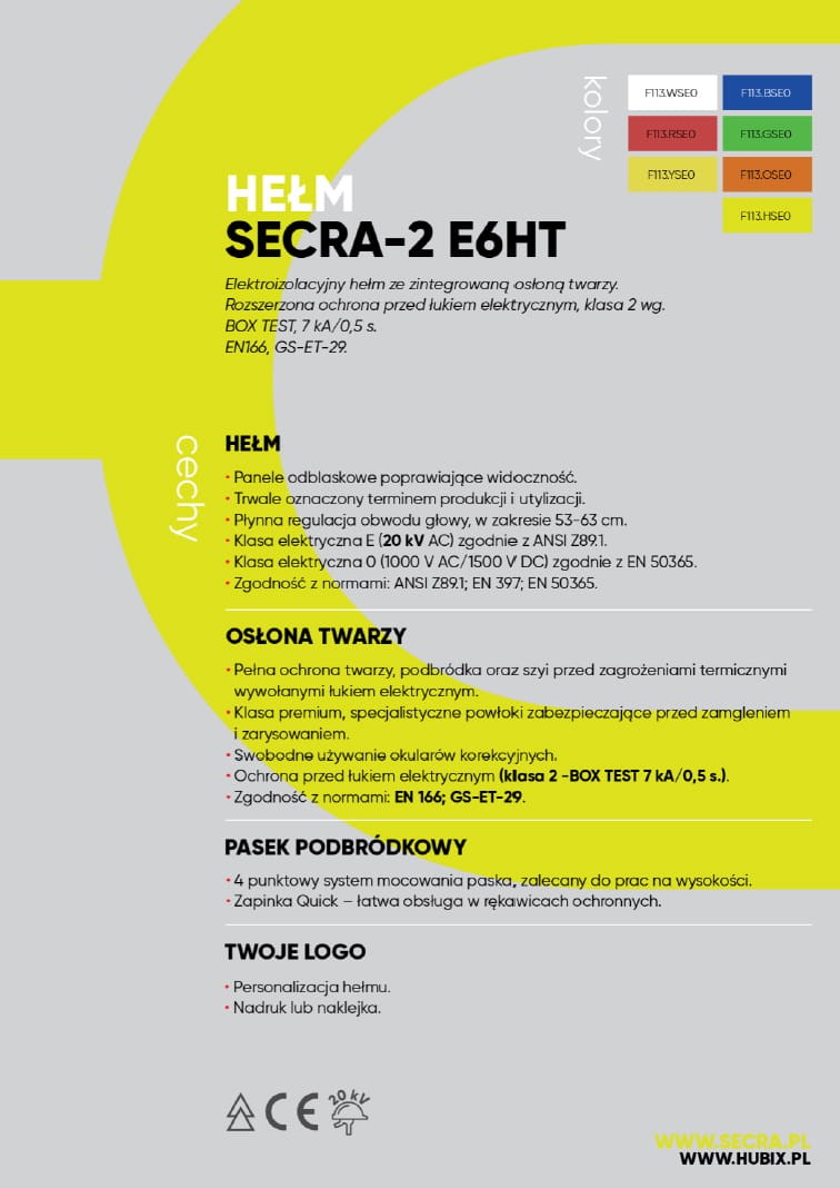 Nowością w PROSPERSKLEP Sosnowiec jest elektroizolacyjny hełm SECRA -2 ze zintegrowaną osłoną twarzy E6HT. Hełm wykonany z ABS przeznaczony do prac pod napięciem. Osłona twarzy wykonana z poliwęglanu charakteryzuje się odpornością na uderzenia cząstek o dużej prędkości – B ochroną przed kroplami i rozbryzgami cieczy – 3 ochroną przed łukiem elektrycznym – 8 ochroną przed stopionymi metalami i gorącymi ciałami stałymi – 9 oraz odpornością na zamglenie - N. Atutem modelu SECRA-2 w nowej odsłonie jest doskonałe wyważenie i 4-punktowy pasek podbródkowy zalecany do pracy na wysokości oraz funkcja szybkiego zapięcia, która ułatwia obsługę w rękawicach ochronnych.