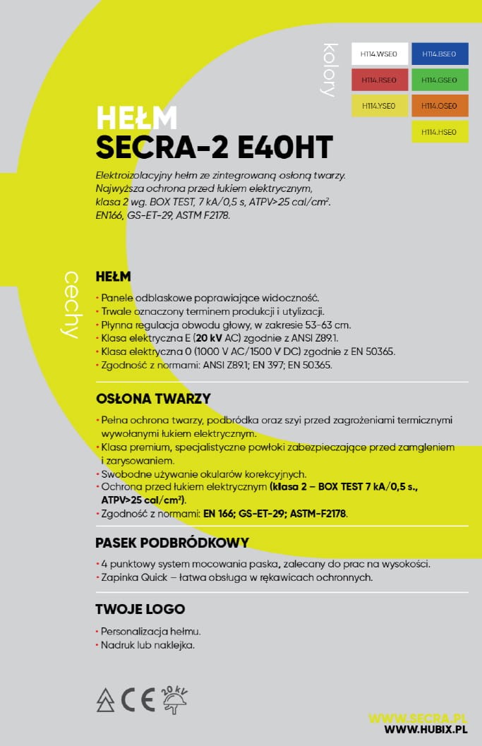 Nowością w PROSPERSKLEP Sosnowiec jest elektroizolacyjny hełm SECRA -2 ze zintegrowaną osłoną twarzy E40HT. Hełm wykonany z ABS przeznaczony do prac pod napięciem. Osłona twarzy wykonana z poliwęglanu charakteryzuje się odpornością na uderzenia cząstek o dużej prędkości – B ochroną przed kroplami i rozbryzgami cieczy – 3 ochroną przed łukiem elektrycznym – 8 ochroną przed stopionymi metalami i gorącymi ciałami stałymi – 9 oraz odpornością na zamglenie - N. Atutem modelu SECRA-2 w nowej odsłonie jest doskonałe wyważenie i 4-punktowy pasek podbródkowy zalecany do pracy na wysokości oraz funkcja szybkiego zapięcia, która ułatwia obsługę w rękawicach ochronnych.