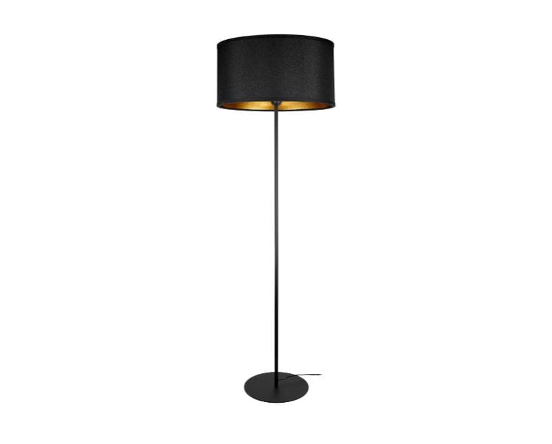 - matowa, czarna rama pomalowana proszkowo, została wykonana z metalu i tworzywa sztucznego, natomiast czarno-zloty klosz z tworzywa sztucznego i tkaniny