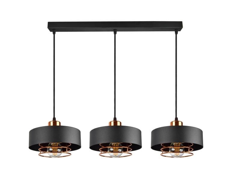 - elementy lampy wykonane są z metalu malowanego proszkowo na kolor czarny, klosze mają formę cylindryczną, a żarówki otoczone są dekoracyjnymi elementami w kolorze miedzi
