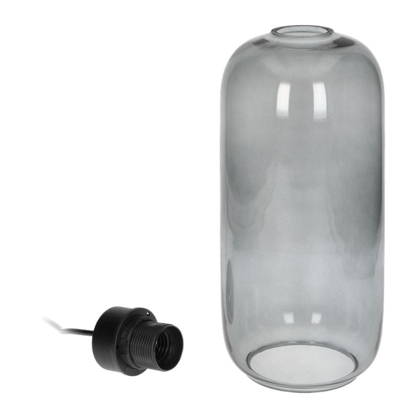 - stelaż w kolorze czarno został wykonany z metalu i tworzywa a klosz ze szkła w kolorze lustrzanego grafitu