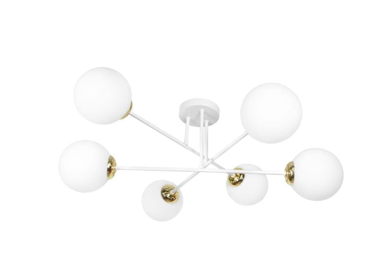 - składa się z białej metalowej rozety, prostych, metalowych ramion malowanych proszkowo na biało-złoto oraz szklanych, mlecznych kloszy