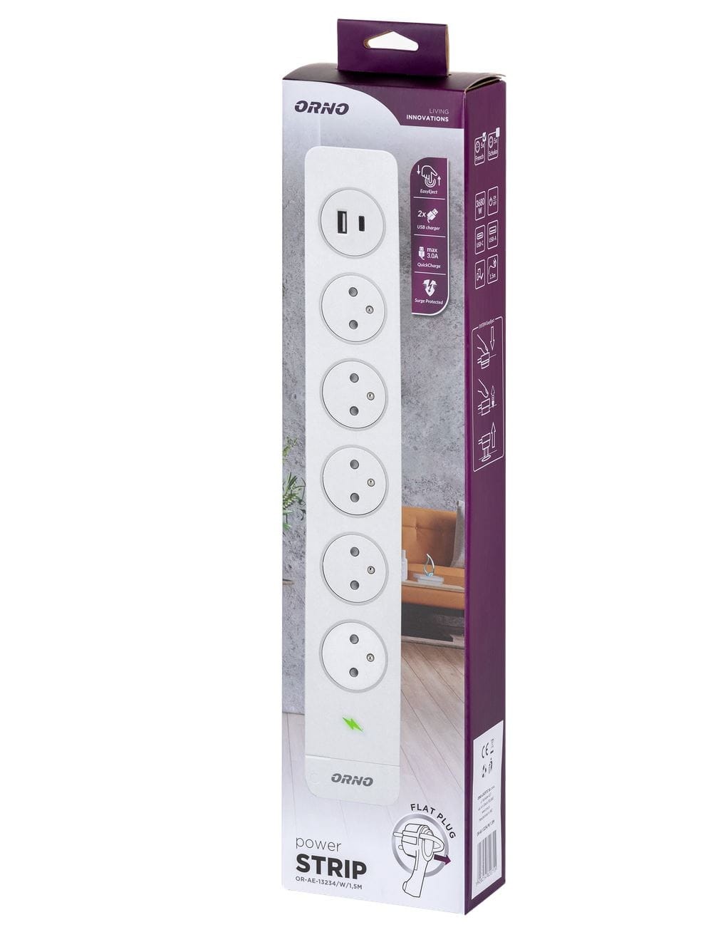 Orno to polska, rodzinna firma z tradycjami, która od ponad 20 lat dostarcza zarówno na rynek polski, jak i europejski urządzenia elektryczne mające zastosowanie w warunkach domowych oraz w przemyśle. Jej produkty wyróżniają się na rynku wyjątkowo wysoką jakością, przy zachowaniu umiarkowanych cen. PROSPERSKLEP właśnie uzupełnił ofertę o jeden z ich nowych produktów – listwę przeciwprzepięciową ORNO OR-AE-13234/W/1,5M, która umożliwia podłączenie 5 urządzeń elektrycznych o łącznym poborze mocy 3680W. Zasilanie jest wyłączane dwutorowym, podświetlanym wyłącznikiem głównym. Jej zadaniem jest zabezpieczenie nasz sprzętu elektrycznego i elektronicznego przed skokami napięcia spowodowanymi warunkami atmosferycznymi lub awariami sieci. Posiada 5 gniazd typu francuskiego (typ E), przełącznik wł./wył oraz przesłony torów prądowych. Jest także wyposażona w 2 wejścia USB, dzięki czemu może pełnić funkcję ładowarki. Dzięki funkcji EasyEject można odłączyć wtyczkę od zasilania poprzez jej naciśnięcie.