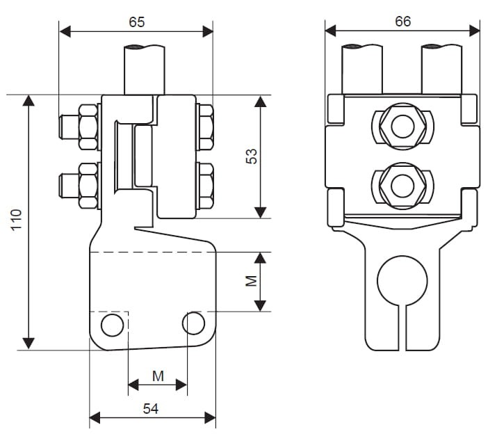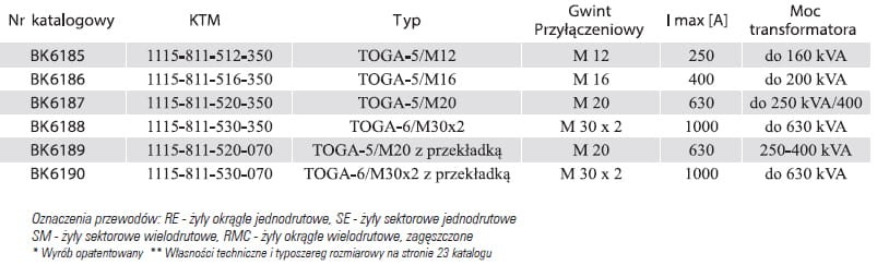 transformatorów rozdzielczych dla typu TOGA 5 dla gwintów w zakresie od M12 do M 20, a typ TOGA 6 do M30x2. Zaciski wyposażone są w zamek cierno sprężysty z dwoma otworami mocującymi, które przecinają się pod kątem prostym. Umożliwiają one zmontowanie zacisku w zależności od potrzeb w położeniu pionowym lub poziomym. Zacisk TOGA 5 umożliwia podłączenie bednarki oraz ograniczników nN na wysięgniku z blachy stalowej ocynkowanej ogniowo.