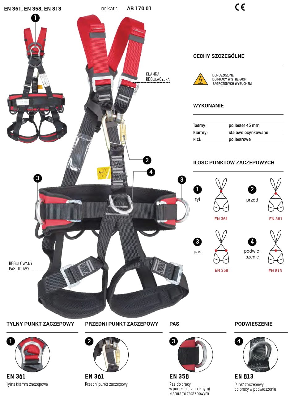 - pełna zgodność z certyfikatem PN-EN 361:2002; PN-EN 358:1999; PN-EN 813:2008 oraz dyrektywą 89/686/EWG/
