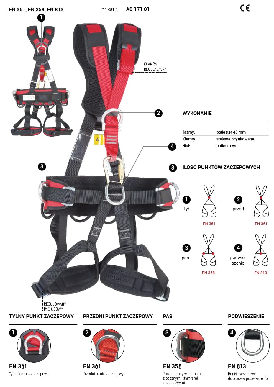 - pełna zgodność z certyfikatem PN-EN 361:2002; PN-EN 358:1999; PN-EN 813:2008 oraz dyrektywą 89/686/EWG/