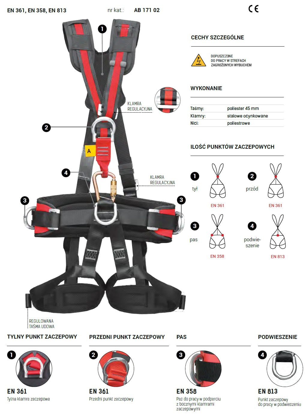 - pełna zgodność z certyfikatem PN-EN 361:2002; PN-EN 358:1999; PN-EN 813:2008 oraz dyrektywą 89/686/EWG/