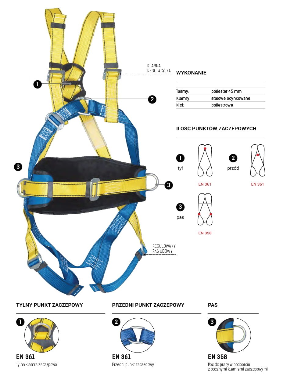 - pełna zgodność z certyfikatem PN-EN 361:2005; PN-EN 358:2002 oraz dyrektywą 89/686/EWG/