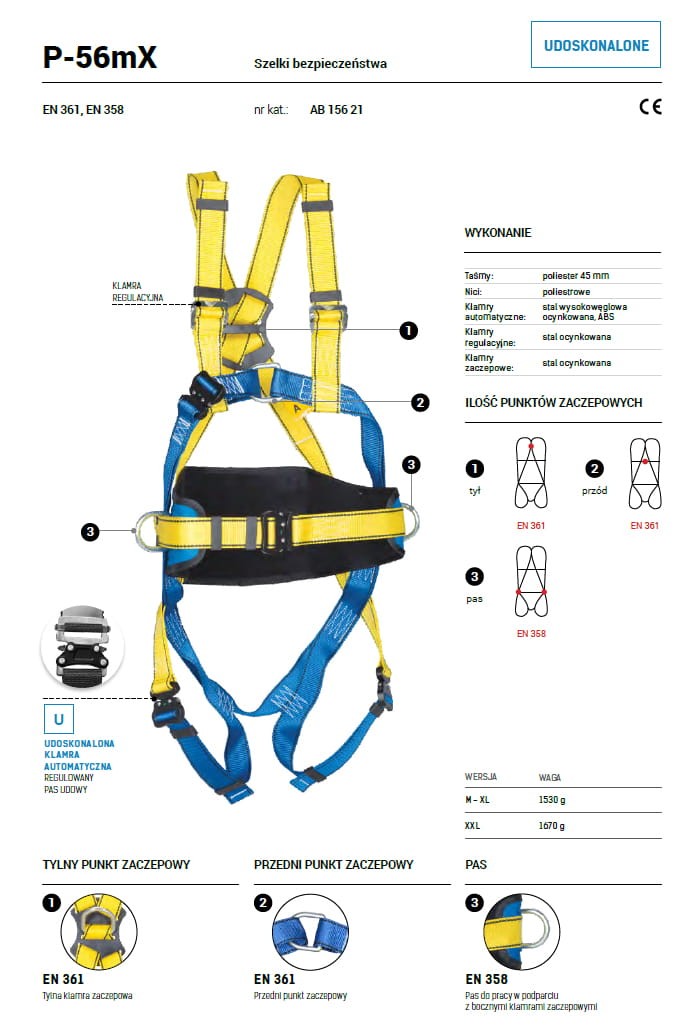 Nowość w PROSPERSKLEP Sosnowiec szelki bezpieczeństwa PROTEKT P-56mX posiadają udoskonalone klamry, wykonane zostały z odcinków taśm odpowiednio ze sobą zszytych i połączonych ze sobą za pomocą klamer metalowych. Powstały w ten sposób układ zapewnia pełny komfort i bezpieczeństwo pracy. Występują w dwóch rozmiarach polecane szczególnie do krótkotrwałych, sporadycznie wykonywanych prac na wysokościach. Ponadto model P56mX posiada pas do pracy w podparciu z bocznymi klamrami zaczepowymi oraz automatyczne klamry stalowe. Zastępują model P-56C.