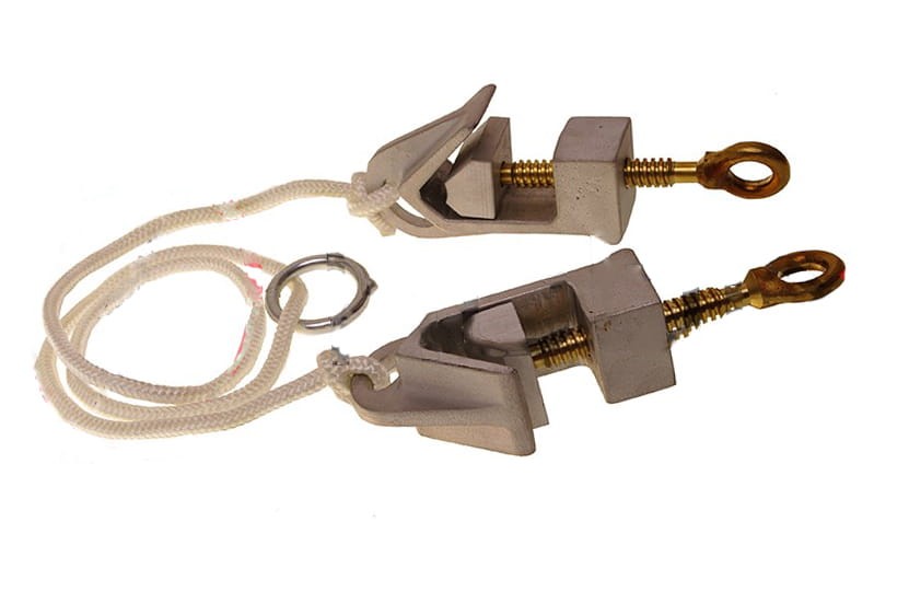 Zaciski śrubowe wykonane ze stopów Al połączone linką polipropylenową o średnicy o 4mm na którą nawleczone jest kółko.