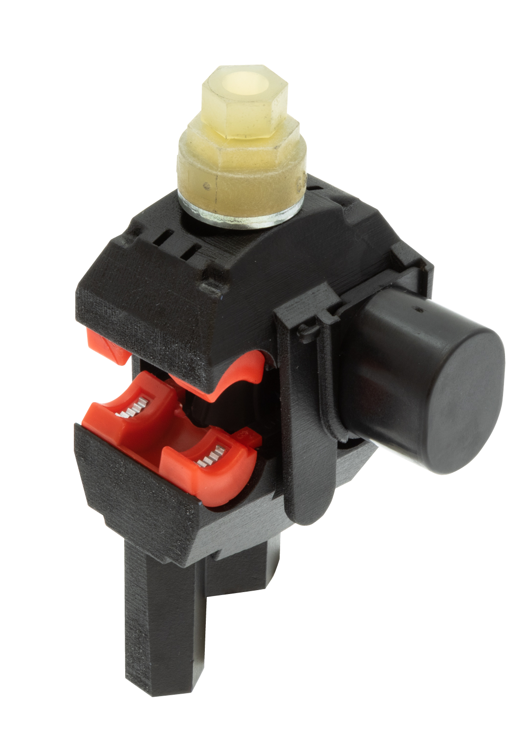 Zacisk przebijający izolację do odgałęzień linii nN i podłączania ograniczników przepięć NTD1 Protect Służy do jednoczesnego wykonywania odgałęzienia przewodem izolowanym (Cu lub Al) od linii gołej linii głównej nN (Cu, Al. AAL i AFL) i podłączenia ogranicznika przepięć (gniazdo M8).