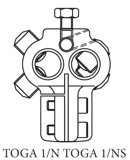 - jeden zacisk bez otworów na kable pomocnicze, ale z frezowanym czołem w celu ułatwienia podłączenia płaskiego przewodu uziemiającego wraz z dodatkowym otworem czołowym dla przewodu uziemiającego 2,5 do 50 mm² rys. b.Toga 1/NS