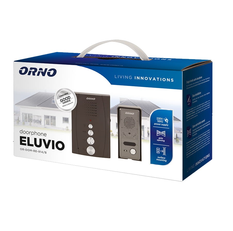 - komplet zestawu ELUVIO (panel zewnętrzny (kaseta) - 1 szt., unifon OR-DOM-RE-914UD/B - 1 szt., daszek zabezpieczający panel przed złym wpływem warunków atmosferycznych i do montażu natynkowego - 1 szt zasilacz do gniazdka 12VDC/1000mA)
