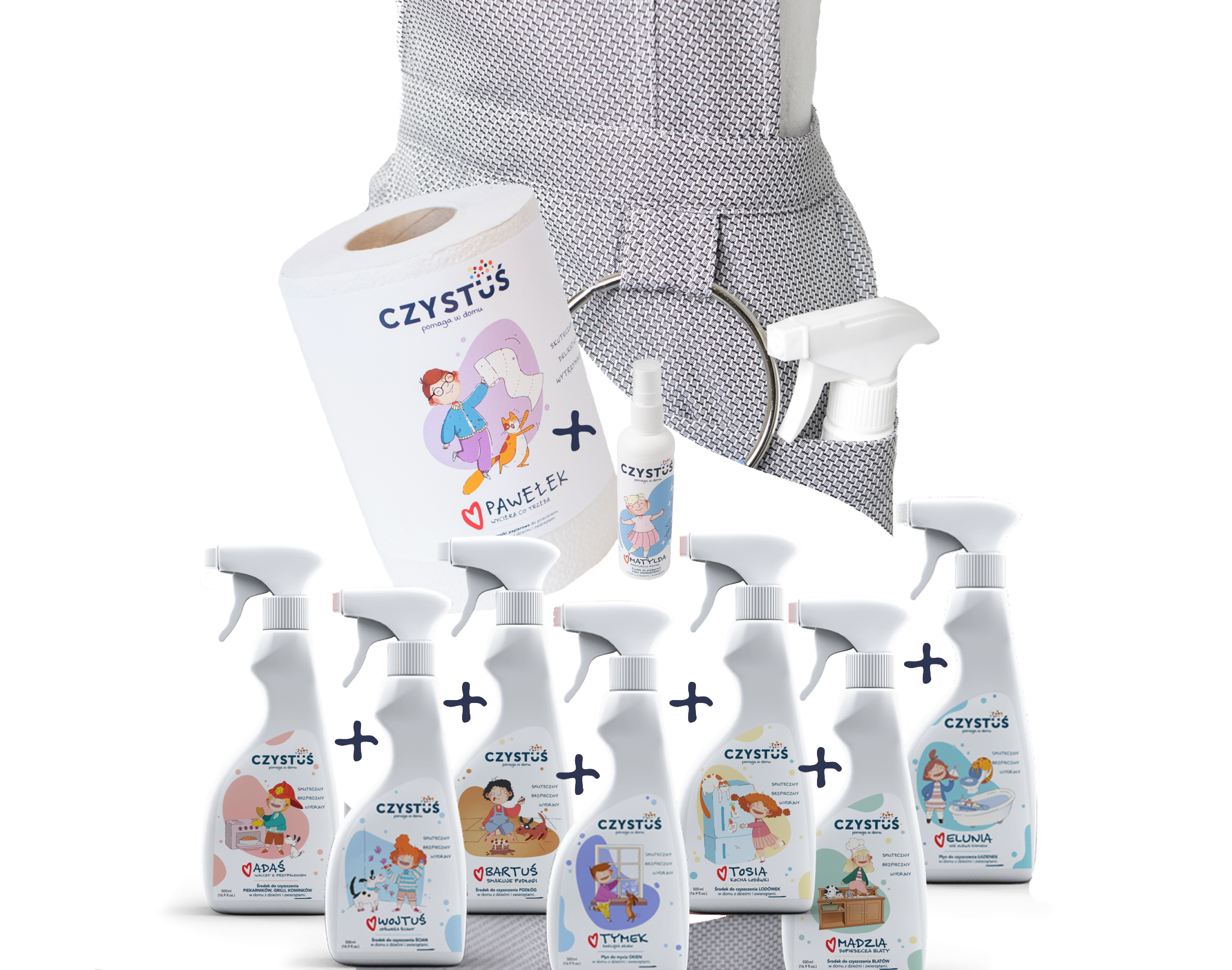 Zestaw startowy ekipy czystusia płyny, środki i ręczniki oraz fartuszek - CZYSTUŚ