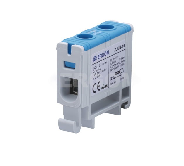 Gigant energetyczny przedsiębiorstwo PROSPERSKLEP z Sosnowca prezentuje niezbędnie akcesorium do rozdzielnic znany i niezawodny produkt firmy ERGOM - złączka instalacyjna 1-torowa ZJUN-16 do przewodów 16mm² 1000V - ZJUN-16/BL.