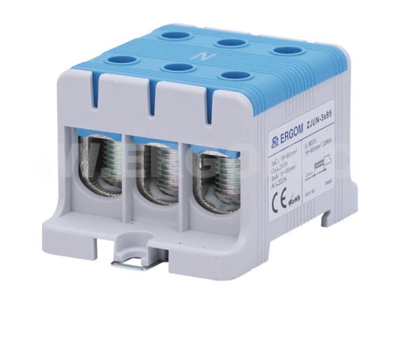 Gigant energetyczny przedsiębiorstwo PROSPERSKLEP z Sosnowca prezentuje niezbędnie akcesorium do rozdzielnic znany i niezawodny produkt firmy ERGOM - złączka instalacyjna trzytorowa ZJUN-3x95 do przewodów 95mm² 1000V - ZJUN-3x95/BL.