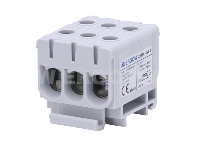 Gigant energetyczny przedsiębiorstwo PROSPERSKLEP z Sosnowca prezentuje niezbędnie akcesorium do rozdzielnic znany i niezawodny produkt firmy ERGOM - złączka instalacyjna trzytorowa ZJUN-3x50 do przewodów 50mm² 1000V - ZJUN-3x50.