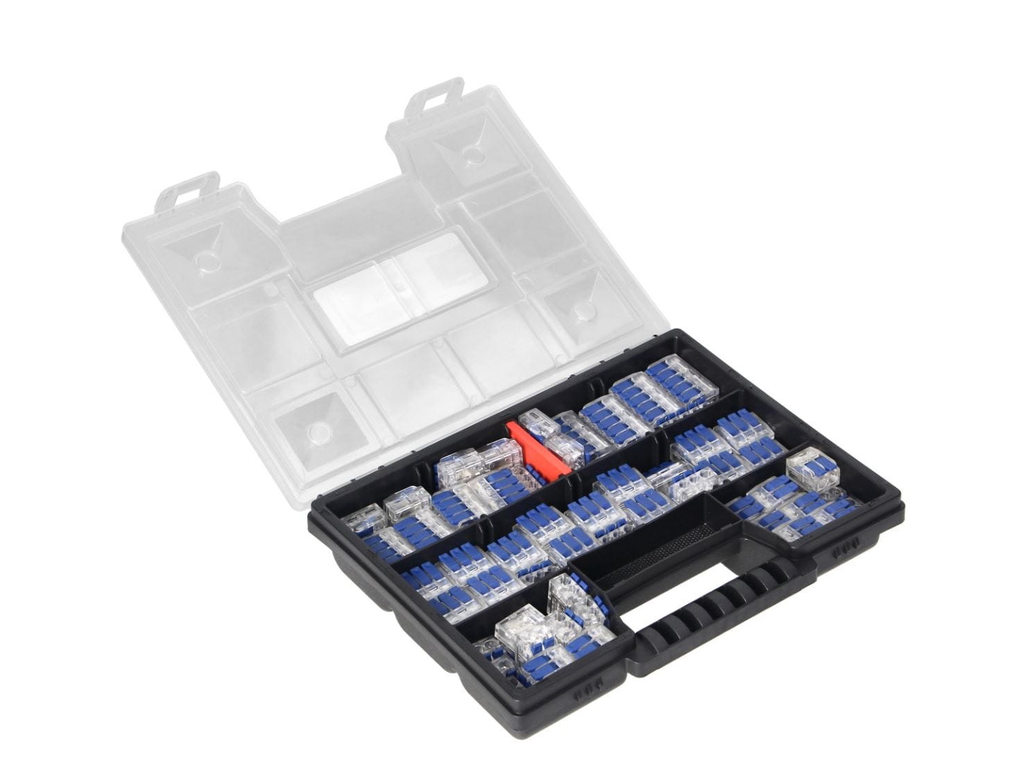 Złączki instalacyjne House Quick 89 sztuk ORNO OR-SZ-8020. Złączki wykonane z wysokogatunkowego tworzywa sztucznego, umieszczone są w wygodnym pudełku z rączką, zamykanym na klik. Zestaw zawiera 89 złączek zaciskowych (32x2-przew. 33x3-przew. 13x4-przew. 11x5-przew.). Dzięki niemu każdy remont stanie się łatwiejszy i przyjemniejszy. Zestaw w pudełku ułatwiającym wyszukiwanie i przenoszenie.