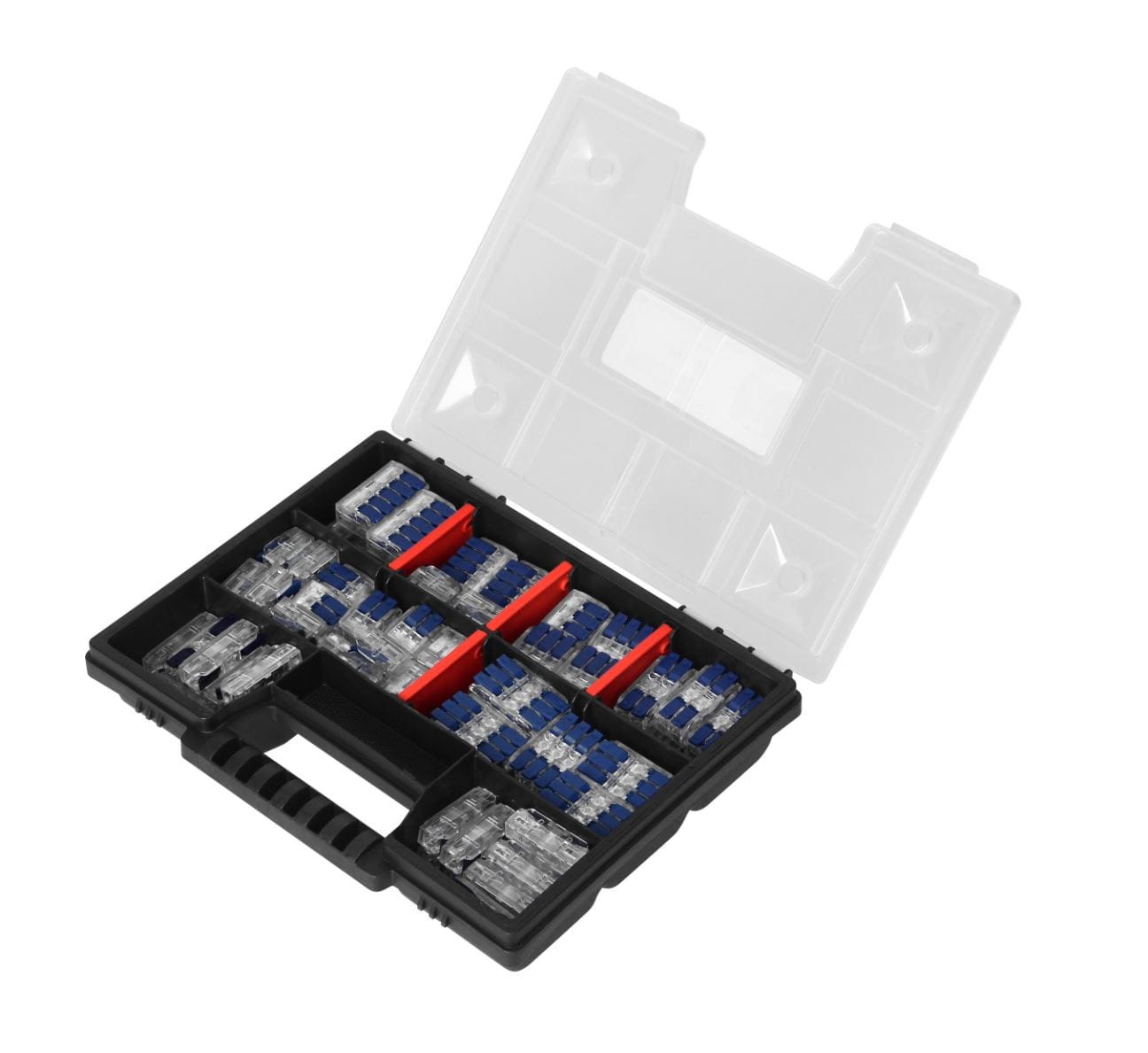 Złączki instalacyjne House Quick Mix 85 sztuk ORNO OR-SZ-8030. Złączki umieszczone są w wygodnym pudełku z rączką, zamykanym na klik. Dzięki napięciom znamionowym 250V i 450V oraz prądzie 32A, złączki są odpowiednie do wielu zastosowań, zapewniając efektywne łączenie przewodów o różnych przekrojach. Zestaw zawiera różne rodzaje złączek jednostronnych, takie jak 24 szt. na 2 przewody, 8 szt. na 3 przewody, 6 szt. na 4 przewody oraz 5 szt. na 5 przewodów. W komplecie znajdują się również złączki dwustronne (przelotowe) w ilościach takich jak 26 szt. na 1 przewód, 6 szt. na 2 przewody oraz 10 szt. na 3 przewody. Dzięki niemu każdy remont stanie się łatwiejszy i przyjemniejszy.