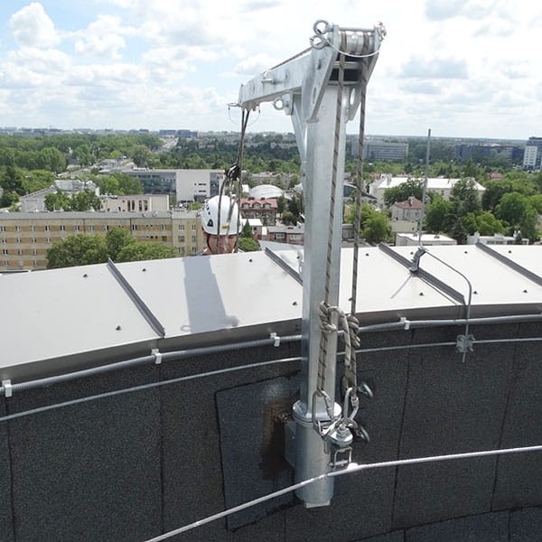 Żurawik obrotowy PTA stosowany jest w dostępie linowym dla prawidłowego sytuowania liny asekuracyjnej i roboczej w stosunku do krawędzi dachu. Współpracuje z gniazdem AT003-1 (do zakupu oddzielnie), w którym następuje obrót żurawika i znajdują się 2 punkty do zaczepienia liny asekuracyjnej i roboczej. Żurawik chroni linę asekuracyjną i roboczą przed uszkodzeniem na krawędzi dachu oraz chroni krawędź dachu przed uszkodzeniami powodowanymi naciskiem liny.